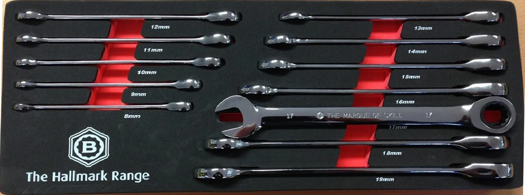 - Britool Hallmark 12 piece Ratchet Combination Spanner Set in Foam Tray.