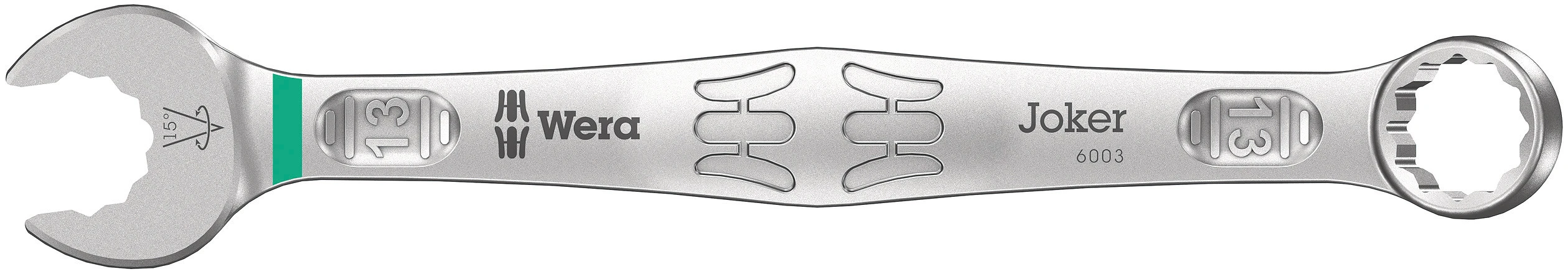 - For very tight spaces – The Joker 6003 ring spanner with its special mouth geometry – a mouth side pivoted by 7.5° and the double hexagon geometry – doubles the placement possibilities when repeatedly turning the wrench 180° around the longitudinal axis. Bolts and screw heads can be “taken“ every 15°. The Joker 6003 will automatically find the respective placement point after every turn.