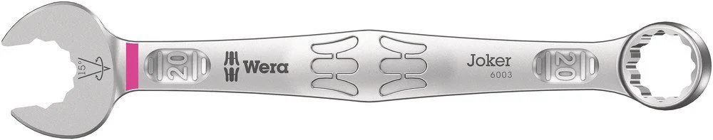 - For very tight spaces – The Joker 6003 ring spanner with its special mouth geometry – a mouth side pivoted by 7.5° and the double hexagon geometry – doubles the placement possibilities when repeatedly turning the wrench 180° around the longitudinal axis. Bolts and screw heads can be “taken“ every 15°. The Joker 6003 will automatically find the respective placement point after every turn.