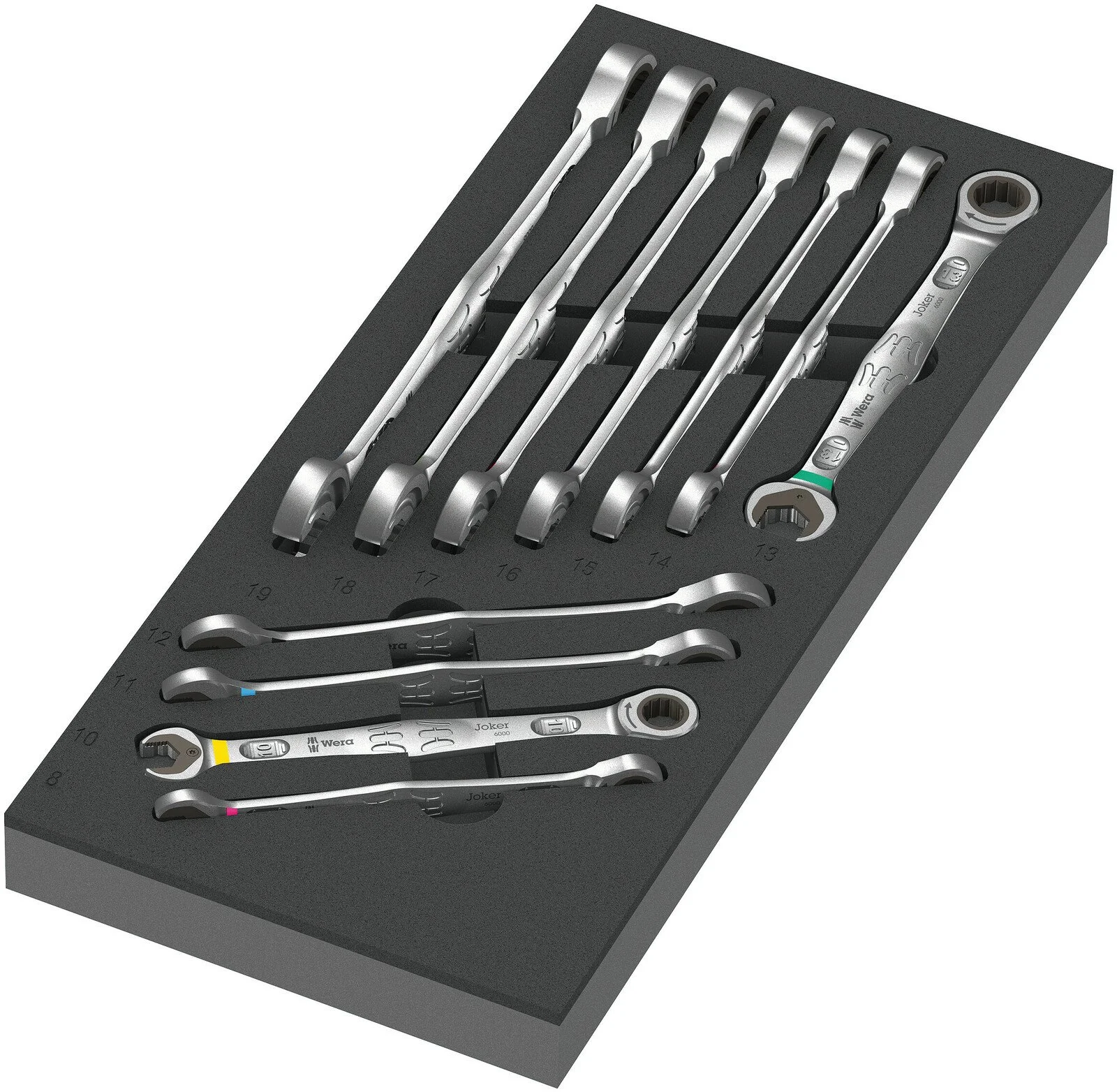Durable foam insert; two-coloured for quick identification of missing parts; suitable for the Tool Rebel roller cabinet; equipped with 11 Wera 6000 Joker ring ratchet spanners .